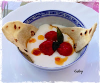 Impiatto versando la crema di stracciatella nelle scodelline, decoro con i pomodori e il loro condimento e spicchi di piadina e foglie di basilico, se serve aggiungo un filo di olio extravergine.